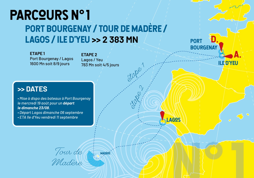 Format unique de 800 milles nautiques, l’épreuve confirme son identité sur un format original sur l’eau avec une boucle autour des Iles du ponant entre l’archipel de Chausey au nord et une bouée devant l’île d’Aix au sud du parcours. 12 des 15 îles du Ponant devront être parées avant de venir en Cornouaille après 5 à 6 jours de course.